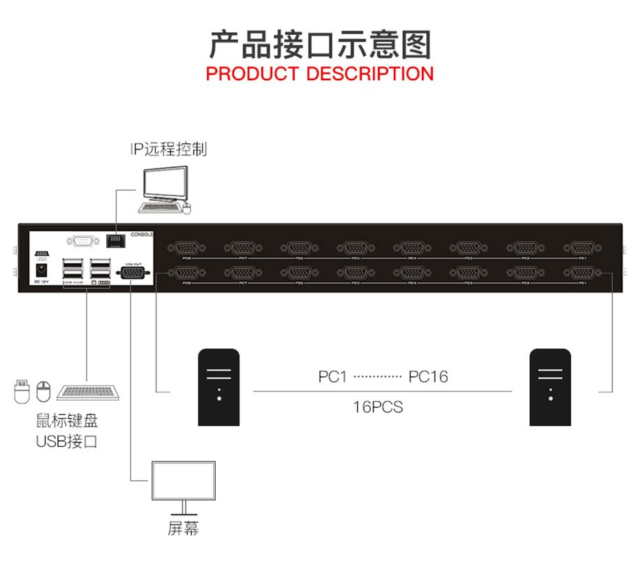 16口数字IP KVM,单台设备可让远程及本地的操作者可管理16台服务器。可以实现对各类服务器和网络设备的远程访问和管理,支持1本地用户在全球任何地方同时操作不同服务器,支持本地通道和数字通道之间的资源相互共享。