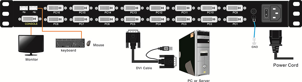 单一控制端管理多达16台电脑主机,通过级联方式最多可控制256台电脑主机